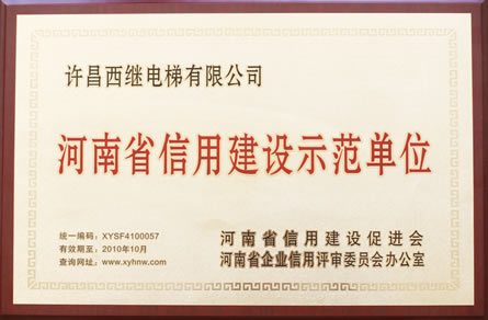 一直以來,西繼電梯都把企業信用建設作為重中之重,牢固樹立“誠信立、事業興”的意識,不斷提升公司品牌的誠信度,做市場中的守信者。公司在履行合約、產品質量、信貸、納稅、勞動保障、環境保護、安全生產等方面,重誠信講信用,營造出了企業良好的社會信譽。在此次評定活動中,評審委員會根據《河南省信用建設示范單位評定實施意見》,授予公司“河南省信用建設示范單位”榮譽稱號。此外,公司還被河南信用建設促進會評定為AAA級信用企業。