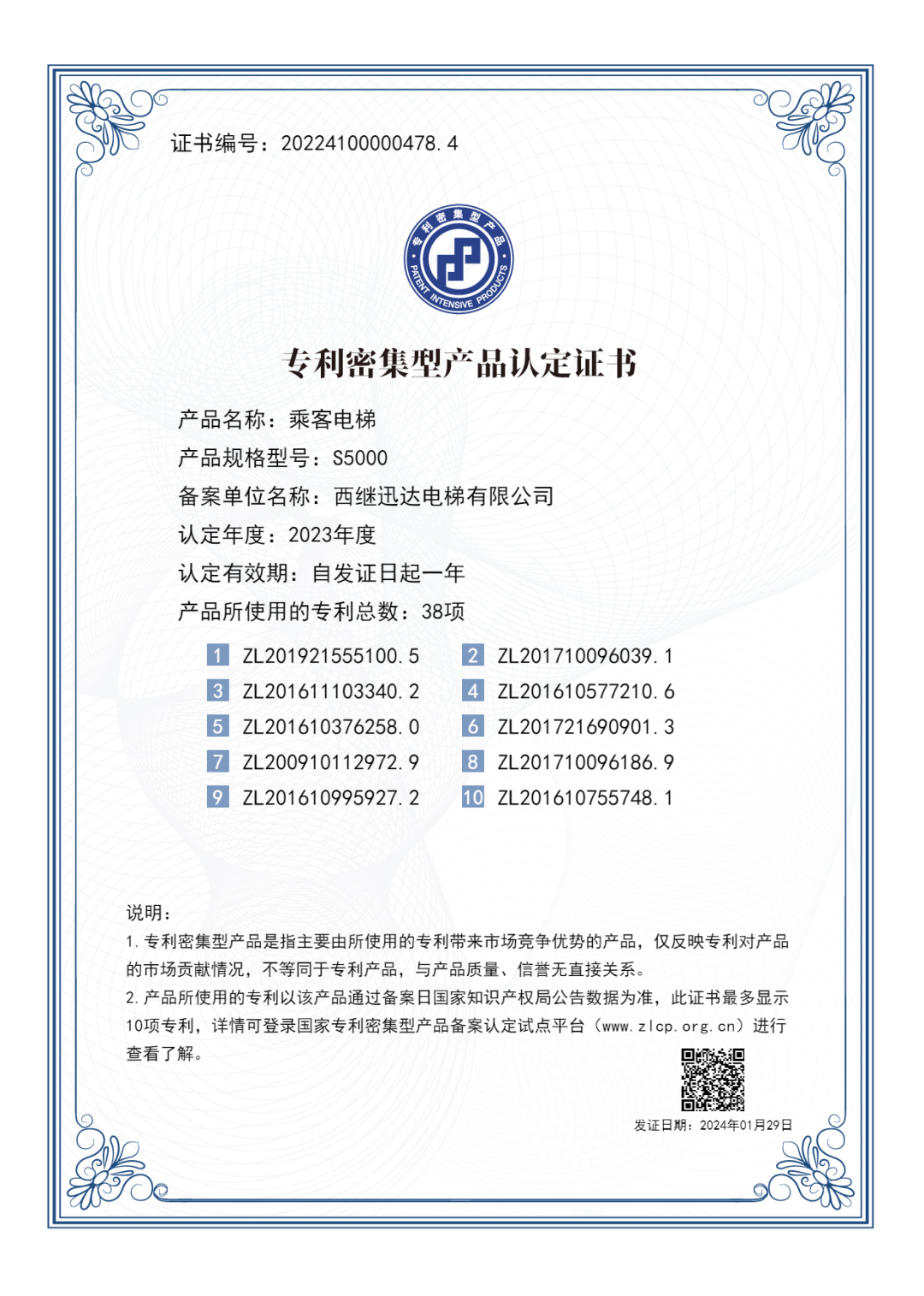西繼迅達此次被認定為國家專利密集型產品是S5000系列乘客電梯,該產品共涉及38件專利技術,是西繼迅達國家企業技術中心歷時多年、經過反復實驗得出的研發成果,于2016年正式推出,截止目前營業收入累計已超百億元,技術含量及產品性能位居行業同類產品前列,獲得廣大客戶的高度認可。西繼迅達成功入選國家專利密集型產品,不僅是對公司技術研發實力以及產品質量的有力證明,也充分展現了其專利產品在市場上的卓越效益和巨大潛力。