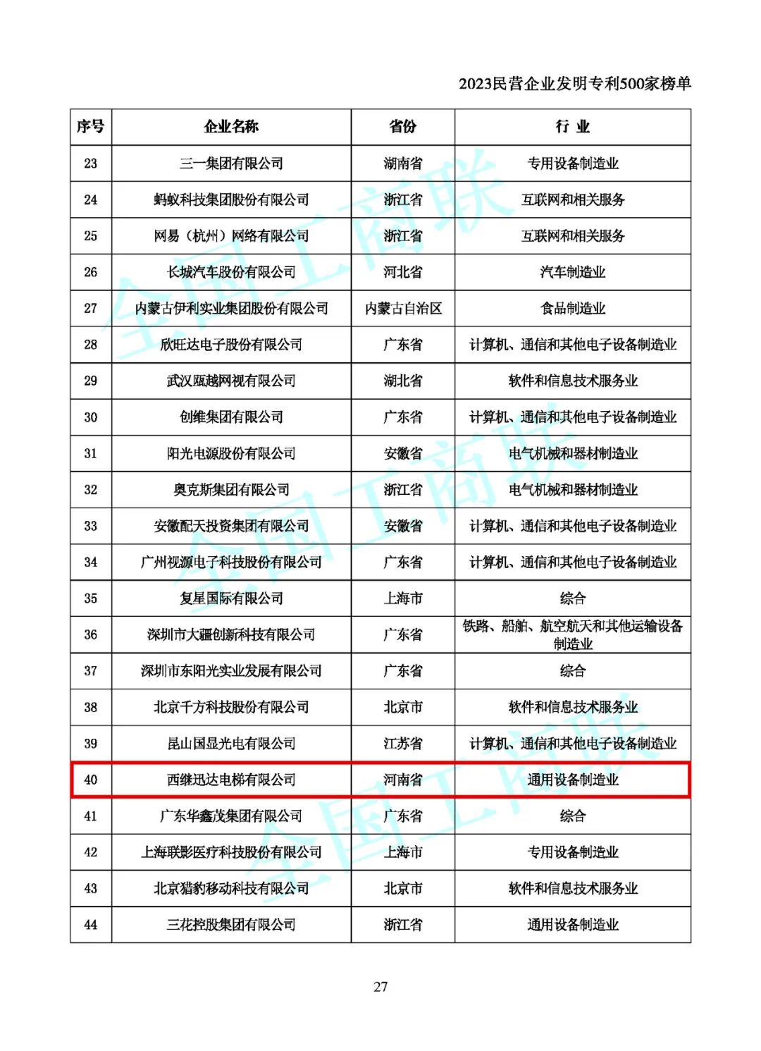 10 月 19 日,2023 全國民營企業(yè)科技創(chuàng)新與標準創(chuàng)新大會在長沙舉行。中央統(tǒng)戰(zhàn)部副部長,全國工商聯(lián)黨組書記、常務副主席徐樂江出席會議。據(jù)悉,會上發(fā)布了 2023 民營企業(yè)發(fā)明專利500 家榜單,8 家河南民營企業(yè)上榜,西繼迅達位列榜單。
