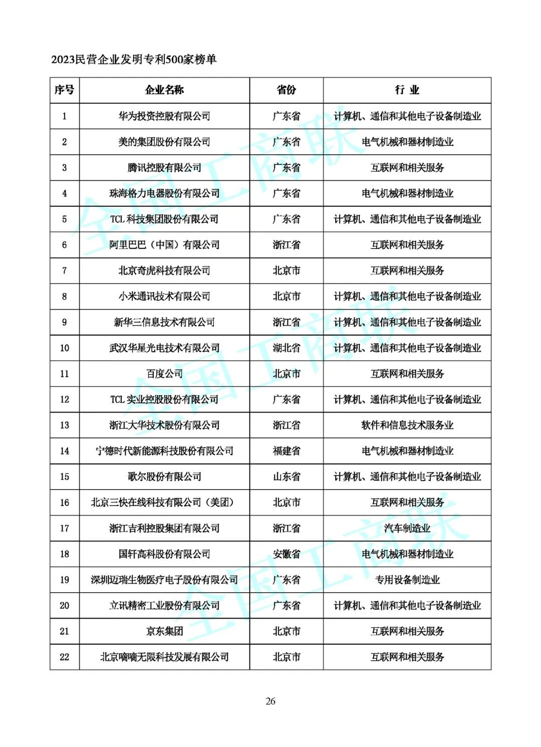 本屆大會由全國工商聯(lián)、湖南省人民政府共同主辦,眾多實力民營企業(yè)代表參會。大會發(fā)布了 2023 民營企業(yè)研發(fā)投入、發(fā)明專利榜單。入圍“2023 民營企業(yè)發(fā)明專利”榜單前十位的分別是:華為投資控股有限公司、美的集團股份有限公司、騰訊控股有限公司、珠海格力電器股份有限公司、TCL 科技集團股份有限公司、阿里巴巴(中國)有限公司、北京奇虎科技有限公司、小米通訊技術(shù)有限公司、新華三信息技術(shù)有限公司、武漢華星光電技術(shù)有限公司。