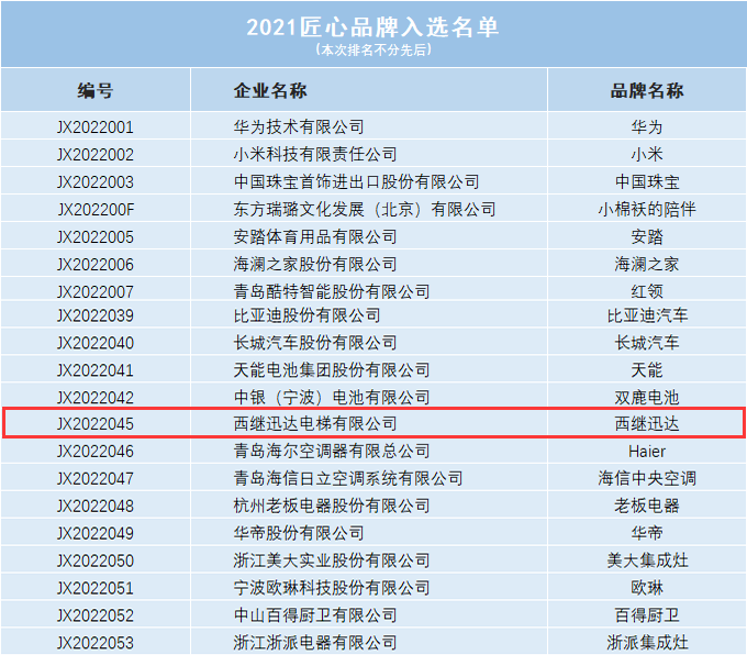 據悉,本次評價于2021年11月30日啟動,歷時三個月,共評價品牌296個,該次評價涵蓋了家居建材、家用電器、工業制造等多個行業領域,其中122個品牌成功入選。最終,西繼迅達得到主辦方的高度肯定,與華為、小米、海爾、安踏等多家知名企業共同入選匠心品牌榜,并被收錄至匠心品牌查詢系統。