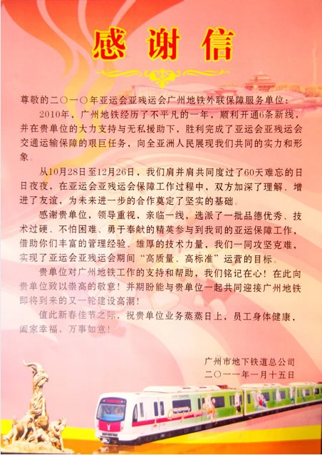 廣州地鐵總公司對于公司在亞運會、亞殘會期間的優異表現,授予公司“亞運會外聯保障服務優秀合作單位”。同時,還專門為公司發來感謝信,感謝公司對廣州地鐵工作的支持,評價西繼電梯實現了亞運會、亞殘會期間“高質量、高標準”運營的目標,并期盼與公司在下步地鐵建設中的再次合作。