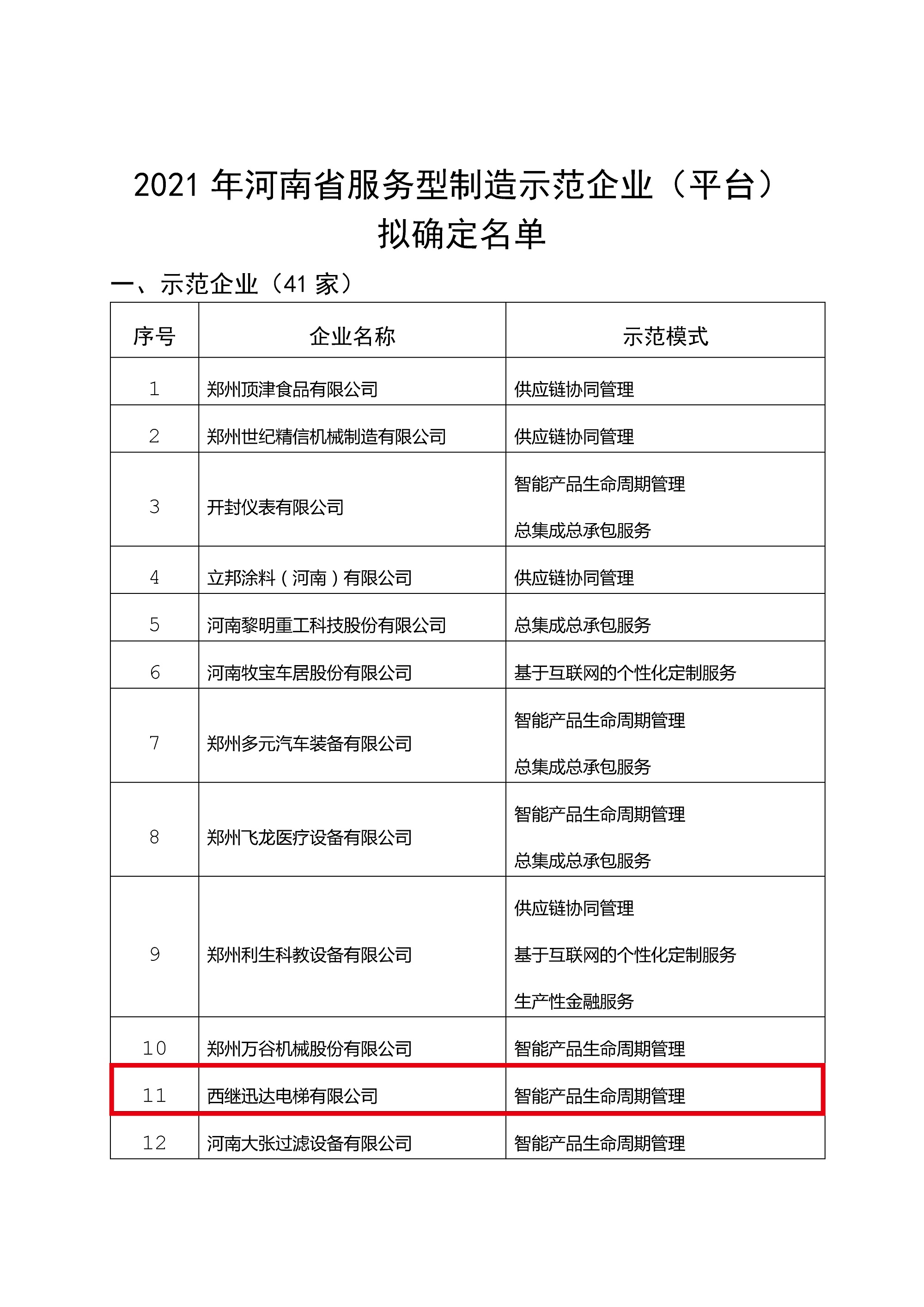 10月11日,省工信廳公示了2021年河南省服務(wù)型制造示范企業(yè)擬確定名單,西繼迅達(dá)位列此次示范企業(yè)公示名單。