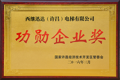 3月4日上午,在國家許昌經濟技術開發區召開的2016年度工作會議上,西繼迅達電梯被開發區管委會授予“功勛企業獎”,開發區黨工委書記、管委會主任王民生親自為劉董事長頒發獎牌及獎金100萬。