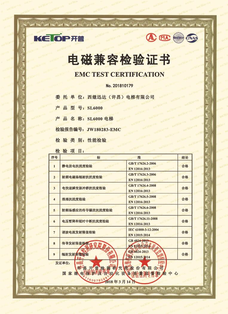 3月14日,西繼迅達SL6000系列客梯、S5000系列客梯,整梯順利通過電磁兼容EMC檢測,符合歐洲EN12015、EN12016標準。