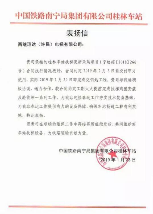 1月2號收到中標(biāo)通知書,1月19號前扶梯完成生產(chǎn)、運(yùn)輸、安裝、外裝修、調(diào)試、通過驗(yàn)收,1月20號正式投入運(yùn)營,為2019年桂林火車站春運(yùn)工作提供最大程度的保障。
