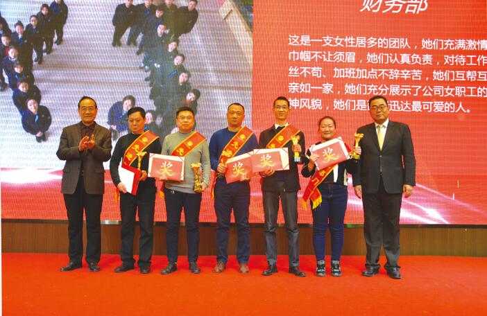 隨后,公司副總經(jīng)理、工會主席陳衛(wèi)東宣讀了《關于表彰2018年度工會工作先進部門和先進個人的決定》,為表彰先進,弘揚正氣,公司對于2018年度涌現(xiàn)出來的5個先進部門、32名首席員工、8名巾幗標兵予以通報表彰。頒獎典禮上,在歡樂激昂的的樂曲聲中,劉董事長和劉總經(jīng)理親自為先進部門、首席員工和巾幗標兵頒發(fā)榮譽證書、獎杯、獎金或獎品,并興致勃勃地與先進部門、首席員工、巾幗標兵合影留念。
