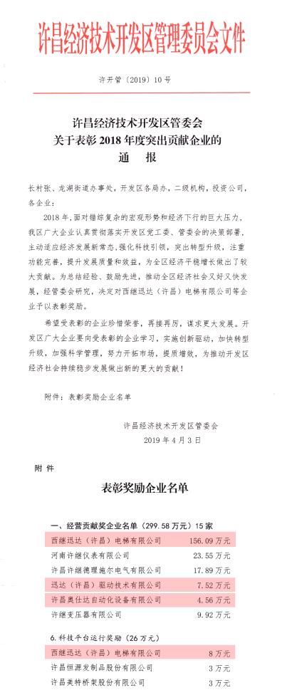 4月12日,西繼迅達(dá)電梯在經(jīng)濟(jì)技術(shù)開發(fā)區(qū)管委會召開的2019年度工作會議上,被開發(fā)區(qū)管委會通報表揚,授予經(jīng)營貢獻(xiàn)獎,并給予156萬元現(xiàn)金獎勵,位列經(jīng)營貢獻(xiàn)獎企業(yè)首位。此外,西繼迅達(dá)還被授予8萬元科技平臺運行獎勵。