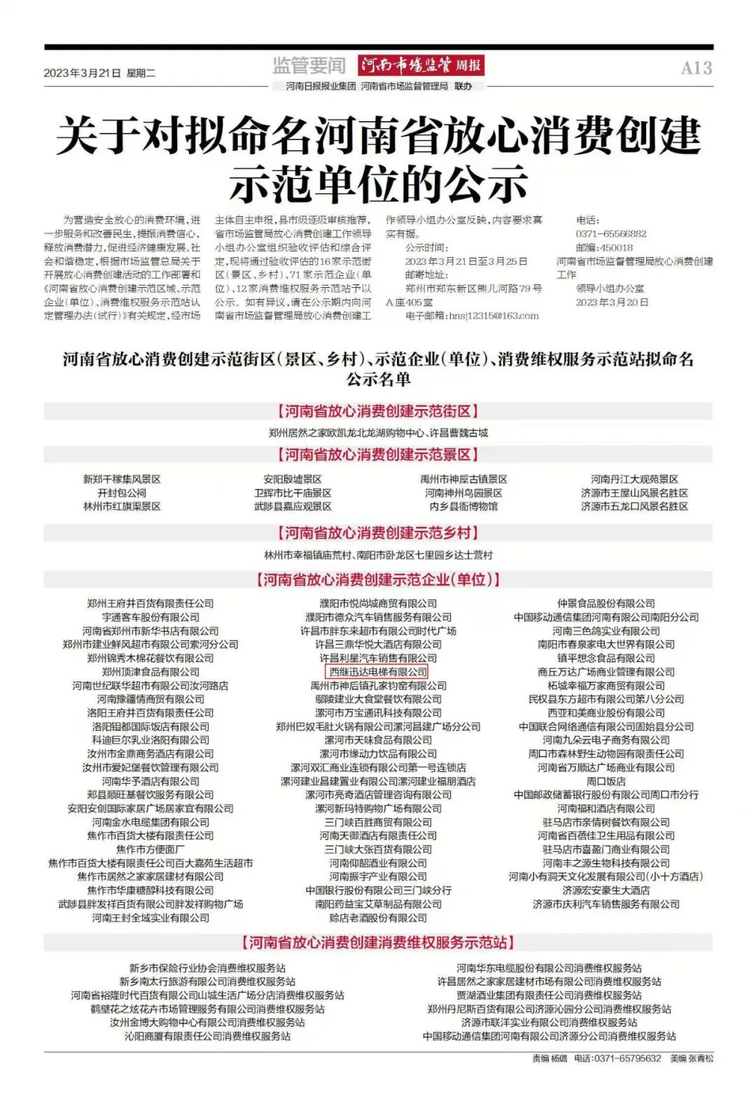 西繼迅達(dá)被評為河南省放心消費(fèi)創(chuàng)建示范企業(yè)
